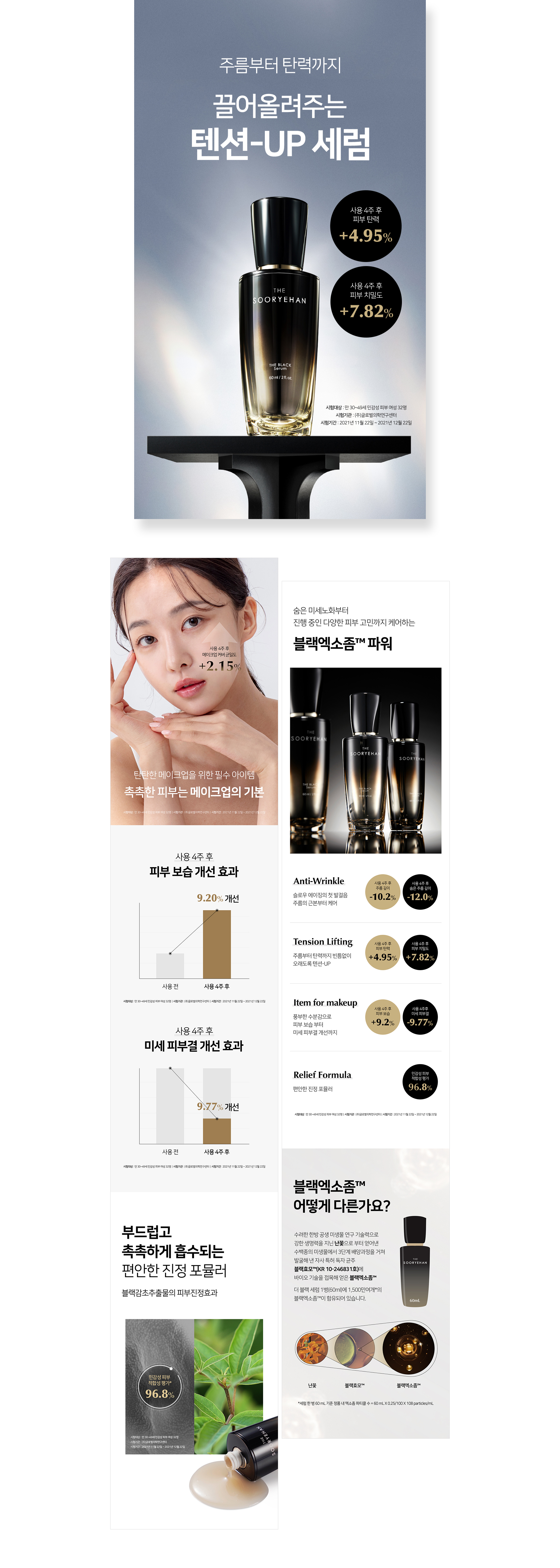 한방의 지혜를 재해석하여 현대의 피부고민을 케어하는 브랜드 수려한의 더 블랙 세럼 상세페이지 리뉴얼 작업을 진행하였습니다. 기존에 제작하였던 상세 디자인에서 비주얼적인 강조를 더욱 주었으며 설명은 보다 간결하고 직관적으로 제품의 효능을 설명하기위해 기획 단계부터 진행했습니다. 수려한만의 고급스러움과 더 블랙 라인의 세련됨을 블랙&골드 무드로 표현하였습니다. GIF도 새롭게 추가하여 제품의 만족도를 한눈에 볼 수 있도록 연출하였습니다.